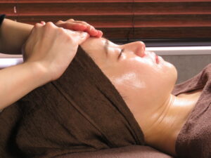【光フェイシャル+小顔オイルトリートメント】のコースの方は、照射後にゆったりとお顔をマッサージしていきます。